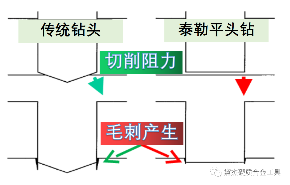 另外,在延展性高的材料的孔出口处,经常会出现像“斗笠状”的大圆锥形毛刺残留在孔出口壁面上,普通钻头一般无法切掉这些毛刺,这需要再增加去除毛刺的工作。但对于【泰勒平头钻TLD型】来说,由于产生的塑性变形小,可以切断这些切屑、毛刺,去除或减少后序去毛刺的工作及负荷,实现减少工序的加工要求。