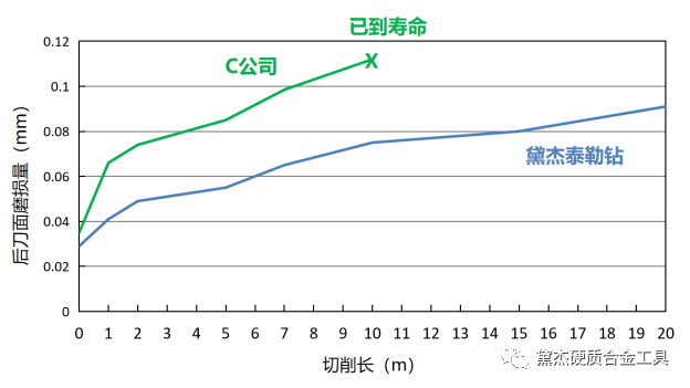 使用5D的【泰勒平头钻TLD5】时,需要先加工深度为7mm的导向孔,然后再进行钻孔加工C公司钻头仅加工了10m长已到寿命;而刚性和排屑优良的【泰勒平头钻TLD5】钻头,即使在20 m加工后,后面刀磨损量仍在0.1 mm以下,是C公司钻头寿命的3倍。此外,因为加工稳定,钻头跳动而导致的刃带部磨损少,因此,钻头的重磨可以更轻松。